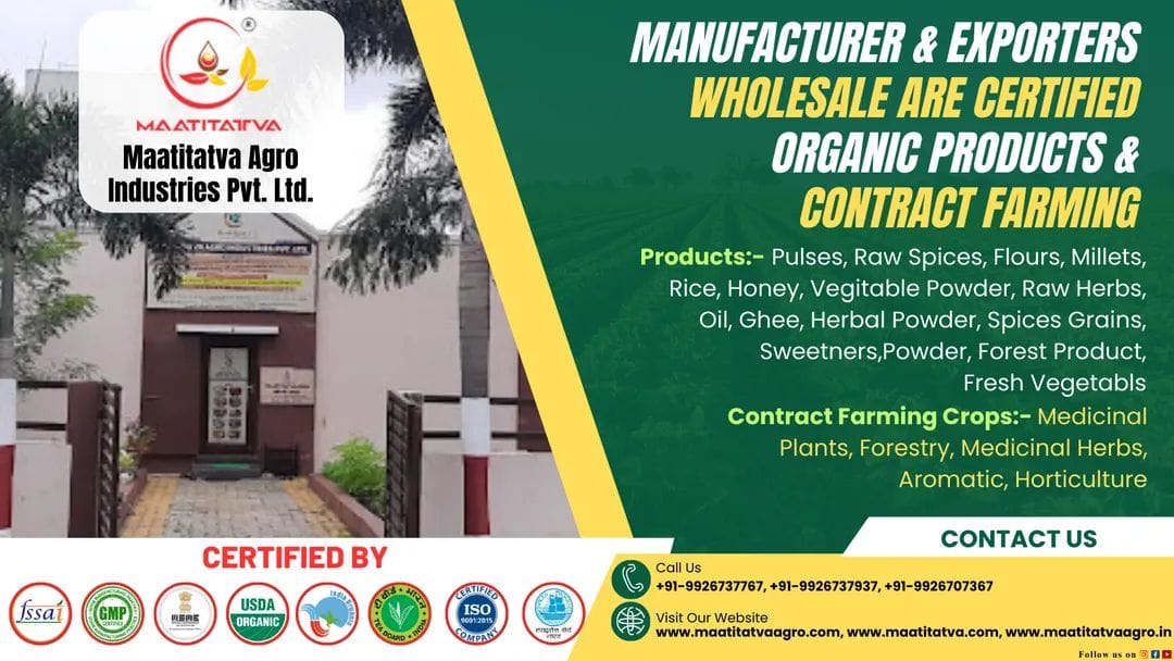 Maati Tatva Agro Industries Pvt ltd. means absolute commitment to quality. All our products are 99.99% pure and 100% organic in nature. We are from among India’s leading companies operating in certified Ayurvedic, Medicinal and Herbal products’ industry.
