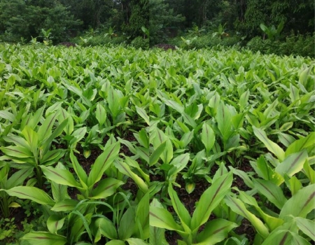 Turmeric (Cucurma longa) known as ‘Haldi’ in Hindi belonging to family Zingiberaceae is a popular and sacred spice from India. It is used as an important condiment and as a dye with varied applications in drug and cosmetic industries. A by-product of turmeric called ‘ Kumkum’ or the sacred vermilion has importance in many Hindu religious ceremonies, offerings and festivals. In India, Andhra Pradesh is the leading state followed by Maharashtra, Tamil Nadu, Orissa, Kerala and Bihar. Turmeric plant grows from the rhizome and the leaves are broad, long and bright green in color. The plant does not have a well-defined stem. The flowers are pale yellow and are borne on spikes. Cultivation: Turmeric is a tropical herb and is grown in both tropics and subtropics. It needs a warm, humid climate for growth. Clayey soil with a large amount of humus is best for growing turmeric; however, it can also grow in sandy soil that is well-drained. Turmeric seed rhizomes from previous harvest are used for cultivation of turmeric in next crop rotation cycle. The planting time varies from state to state, for example, it is around April in Kerala, May in parts of Maharashtra &Karnataka. Approximately, 400kg rhizomes are needed for planting in one acre of land but if it is being used as an intercrop then the seed rate can be 125kg/acre. Depending on the variety, turmeric is ready for harvest within 9-11 months of sowing. They are ready for harvest when the leaves and the stem start turning brown and dry up progressively. Generally, pure turmeric yields a quantity of 10000 kg /acre.