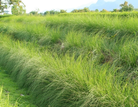 Adense, clumping perennial grass, to 1.5 m in height, native in India and Ceylon. 'Monto' is a sterile (non-seed producing) variety specially selected not to become weedy. In its natural environment, vetiver grows on riverbanks up to an altitude of 600m. It requires a hot and humid climate. It is adaptable to a wide range of soil and climatic conditions. It can be established on very acid, sodic, alkaline or saline soils. Vetiver tolerates very high levels of aluminium, manganese and a range of heavy metals in the soil. Due to its extensive and deep root system, vetiver is very tolerant of drought. It can stand extreme heat (50°C) and frost (-10°C) and can be established in areas with an annual rainfall from 450 mm and higher. Vetiver is sensitive to shade and this will slow growth, especially in young plants.